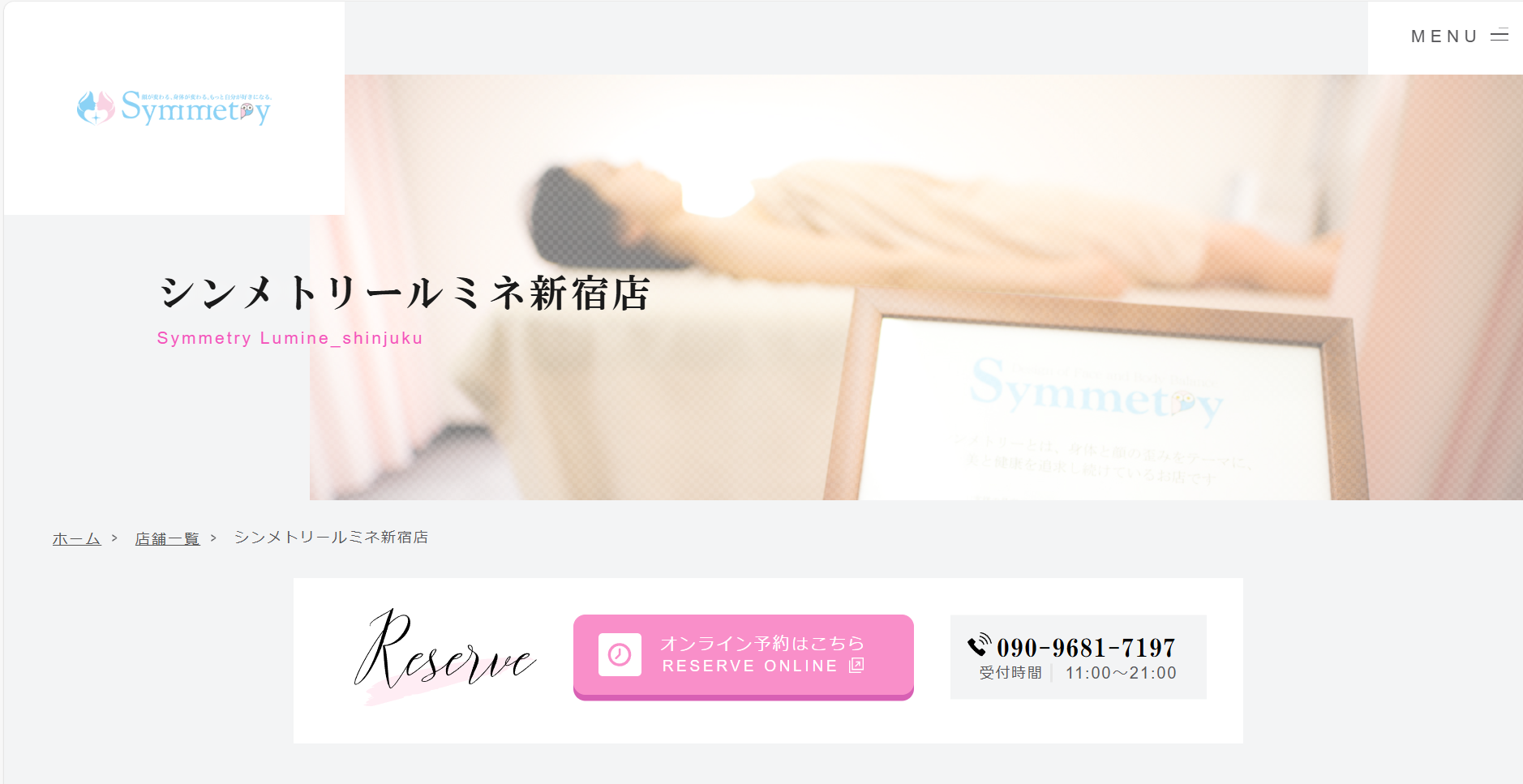 | シンメトリー ルミネ新宿店 | 新宿 | 5,000円〜7,000円 | 10,000円〜18,000円 | 60分〜75分 | Web・電話 |