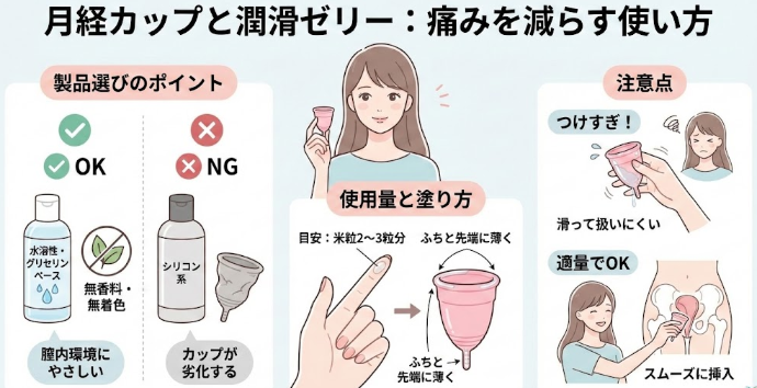 月経カップと併用する潤滑ゼリーは、水溶性でグリセリンベースのものを選ぶようにします。