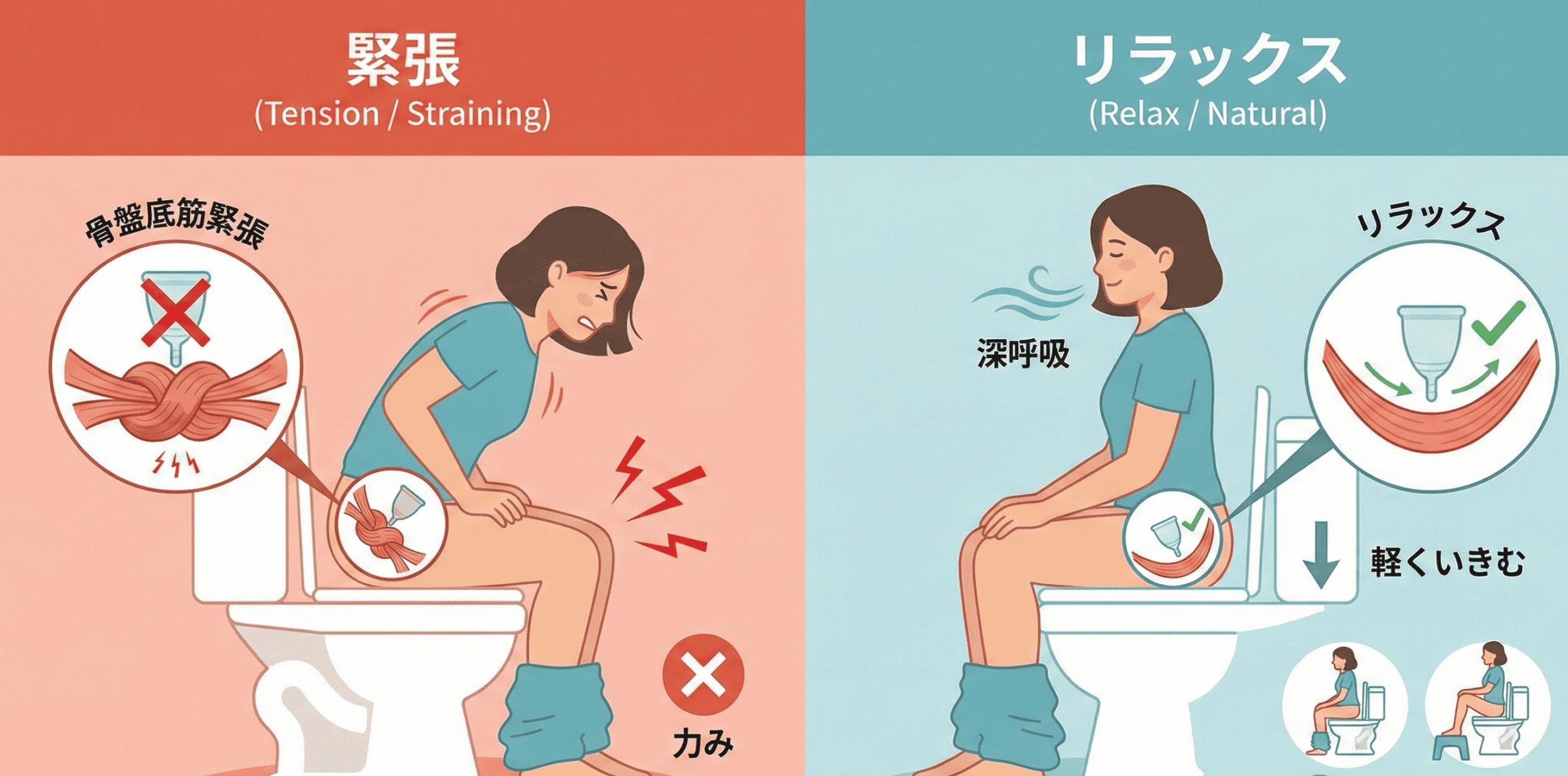 緊張していると膣口が狭くなり、カップが入りづらくなるだけでなく、無理に押し込もうとして痛みや粘膜の傷につながります。