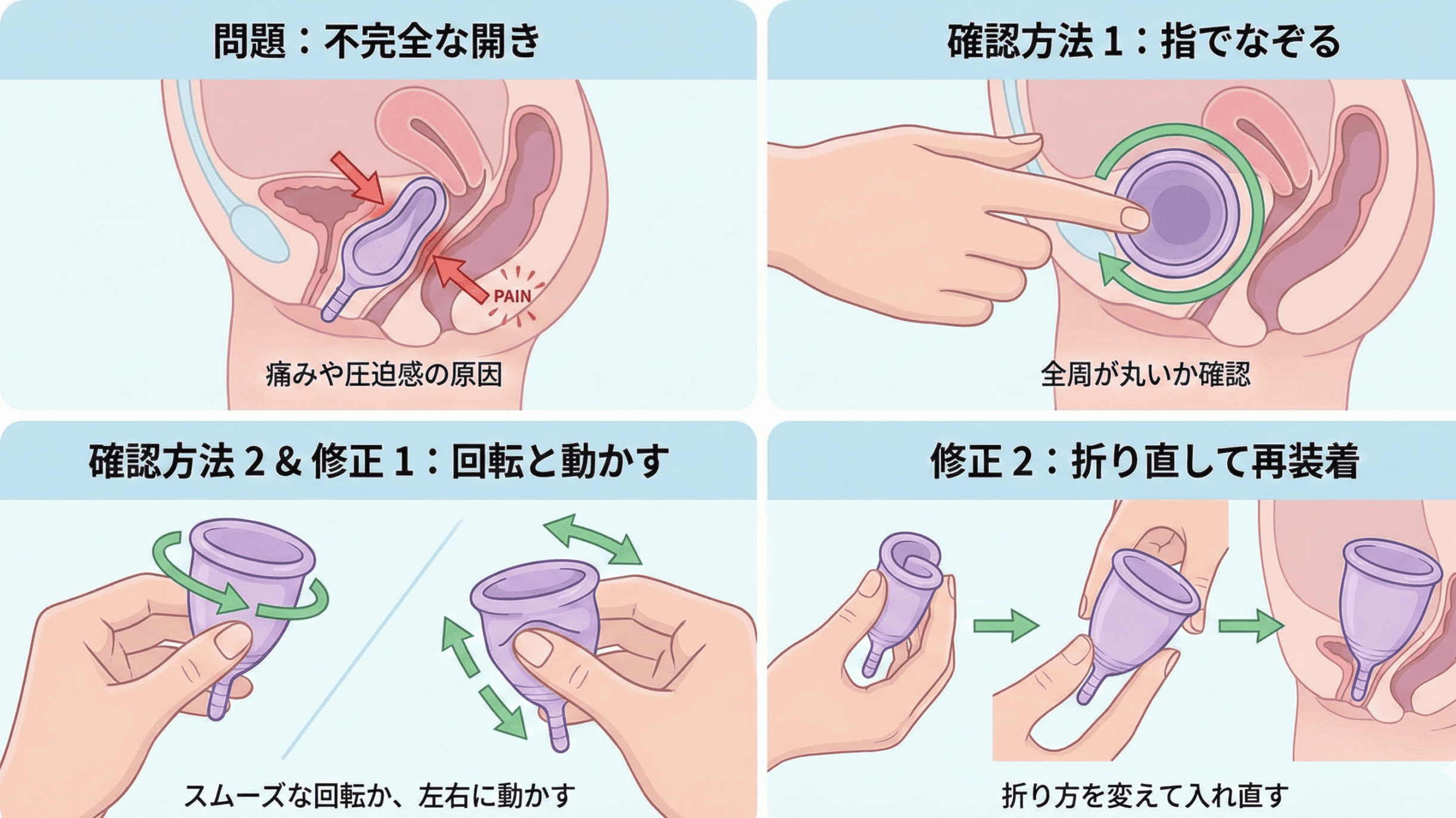 ここでは、装着中の違和感が正常な範囲かどうかを判断するためのチェック項目と、それぞれの調整方法を説明します。正しく装着できていれば、カップは体内で存在を感じないほど快適に使えるものです。