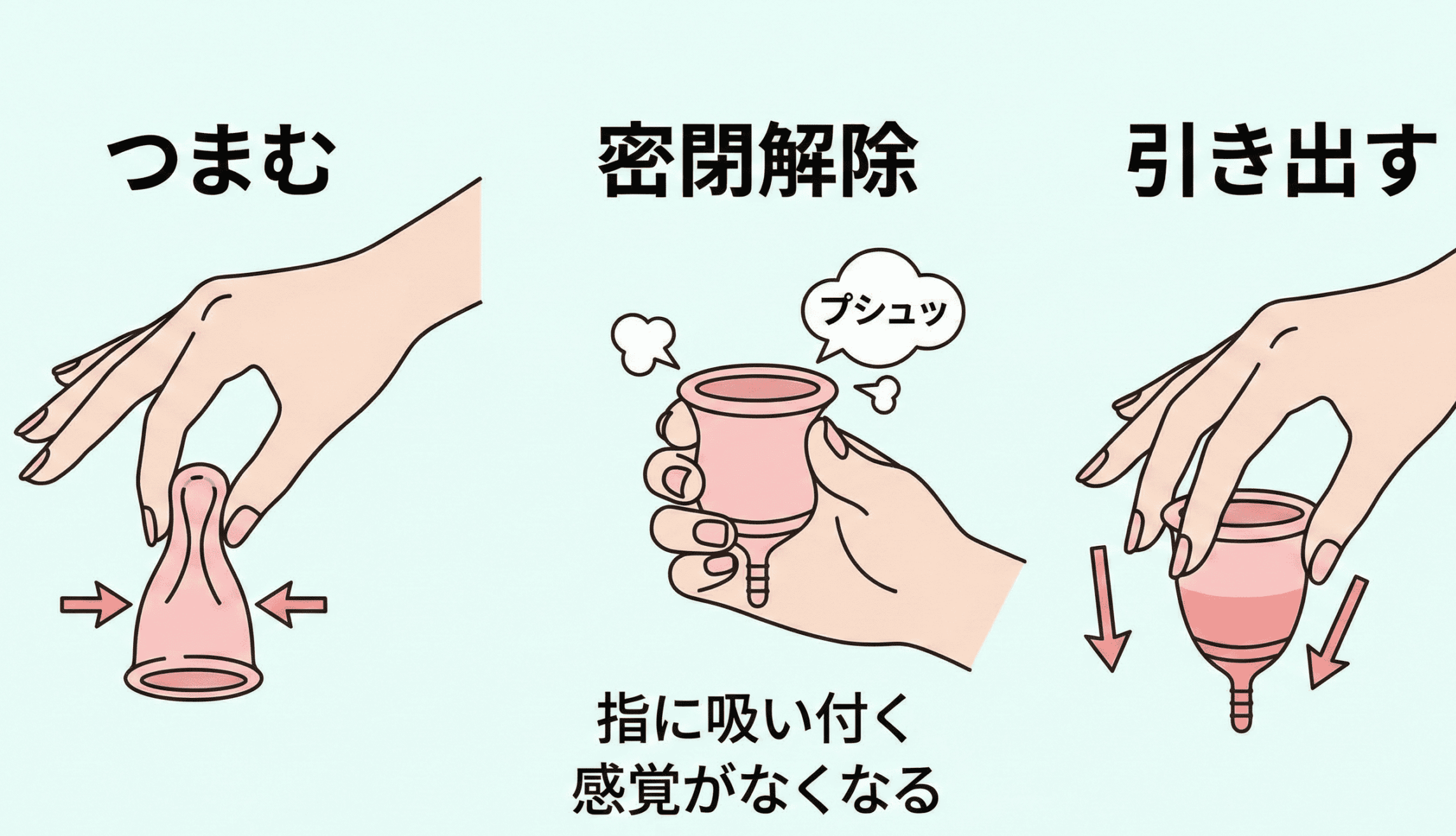 月経カップを取り外す際の痛みは、カップ内部の陰圧が十分に解除されていない状態で引っ張ることが主な原因です。