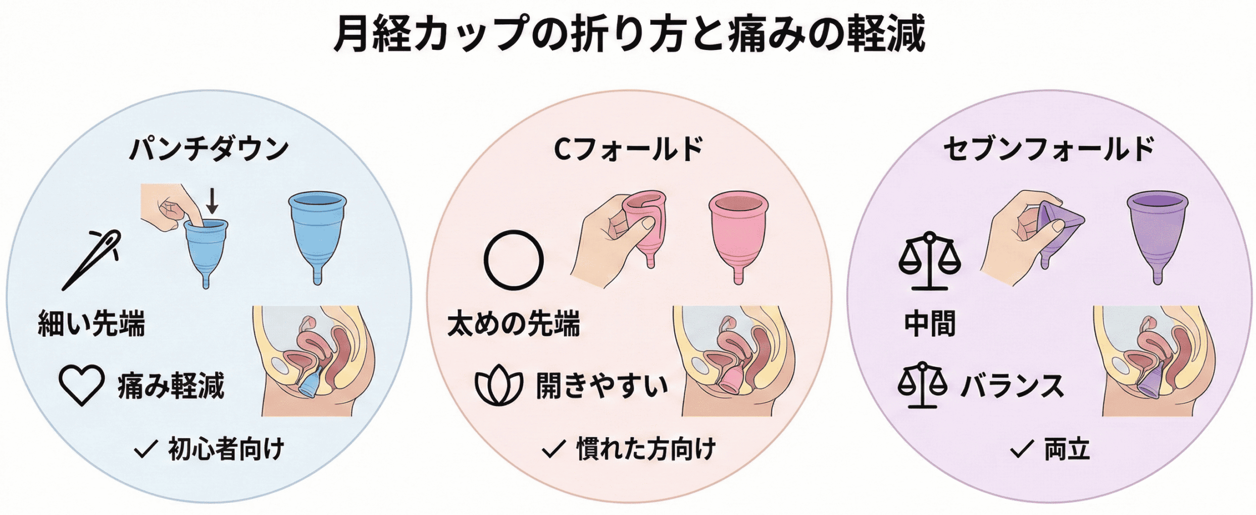 月経カップの折り方によって挿入時の先端の形や太さが変わるため、自分に合った折り方を見つけることで痛みを大きく軽減できます。